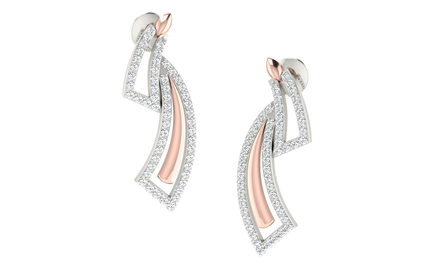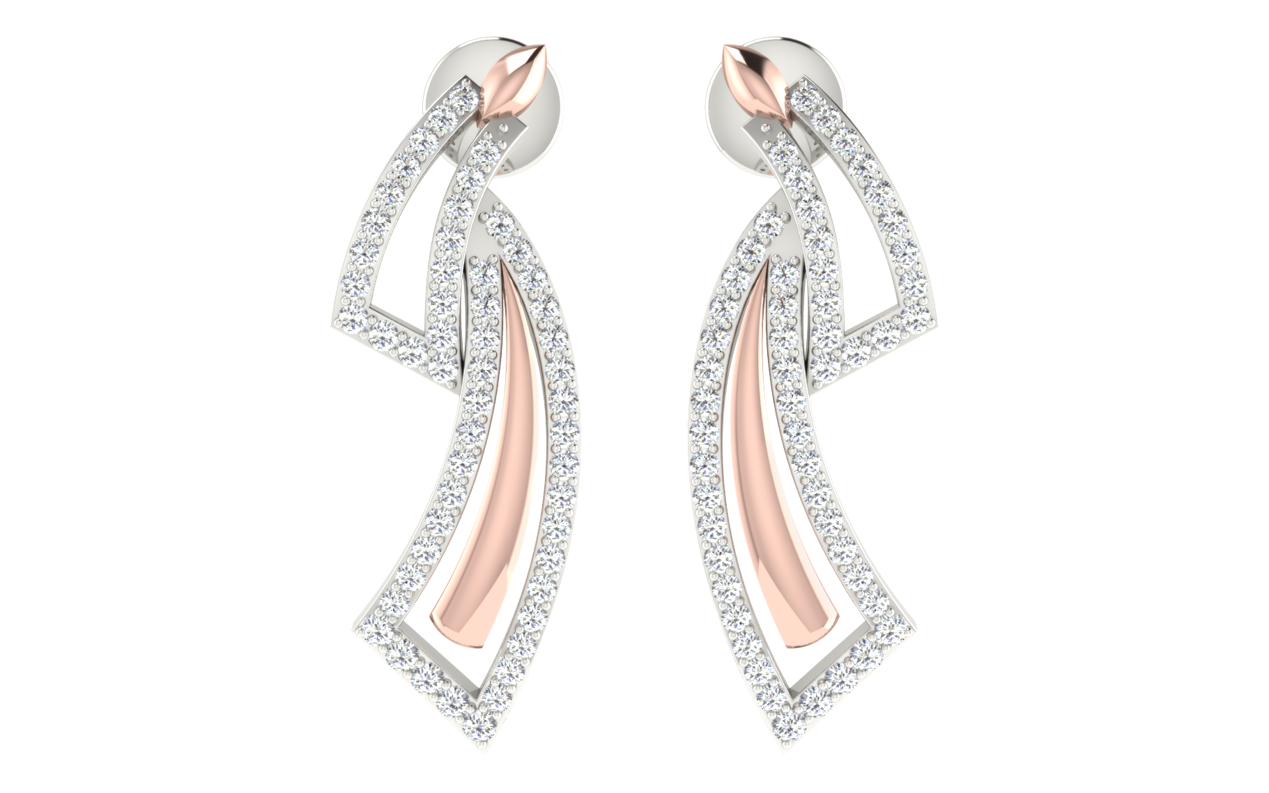 The "Celestial Grace Drop Earrings" are a tribute to modern elegance and sophistication. Crafted in a blend of rose gold and silver tones, they feature a unique asymmetrical design that captivates and intrigues. Each earring gracefully loops into an open geometric shape, encrusted with a multitude of shimmering diamonds that catch the light from every angle, suggesting the limitless sparkle of a starlit sky. The rose gold interior accentuates the warmth and depth of the design, making these earrings a perfect choice for both daytime charm and evening grandeur.