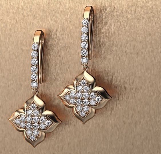 The "Bloom of Radiance Earrings" are an embodiment of floral magnificence in rose gold, blossoming with the brilliance of diamonds. Each earring features a stylized flower motif, its petals elegantly contoured to capture the essence of natural beauty. The center of the flowers are filled with a cluster of diamonds, mirroring the stamen of a bloom and adding a luxurious sparkle. These earrings gracefully dangle from a diamond-lined bar, providing a touch of movement and light. They are a perfect tribute to nature's timeless elegance, suitable for sophisticated events or adding a touch of luxury to everyday wear.