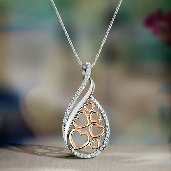 The "Embrace of Hearts Pendant" is an elegant piece that symbolises love in its many layers. A polished silver teardrop gracefully encircles a rose gold heart mosaic, each heart nestled within the other, creating a pattern of unity and affection. The outer curve is lined with diamonds, adding a radiant sparkle that captures the light and mirrors the brilliance of love's embrace. This pendant is a celebration of heartfelt connections, beautifully rendered in precious metals and gems, and suspended on a fine chain to adorn the wearer with a symbol of cherished bonds
