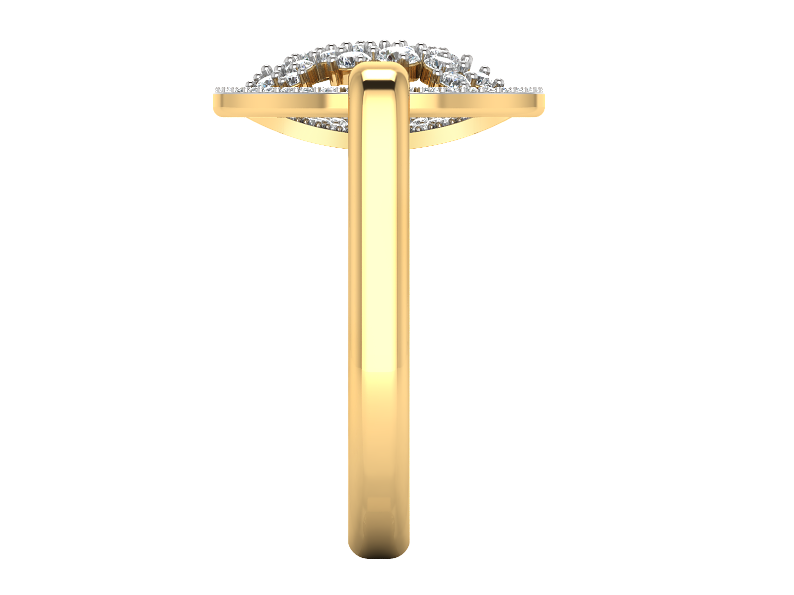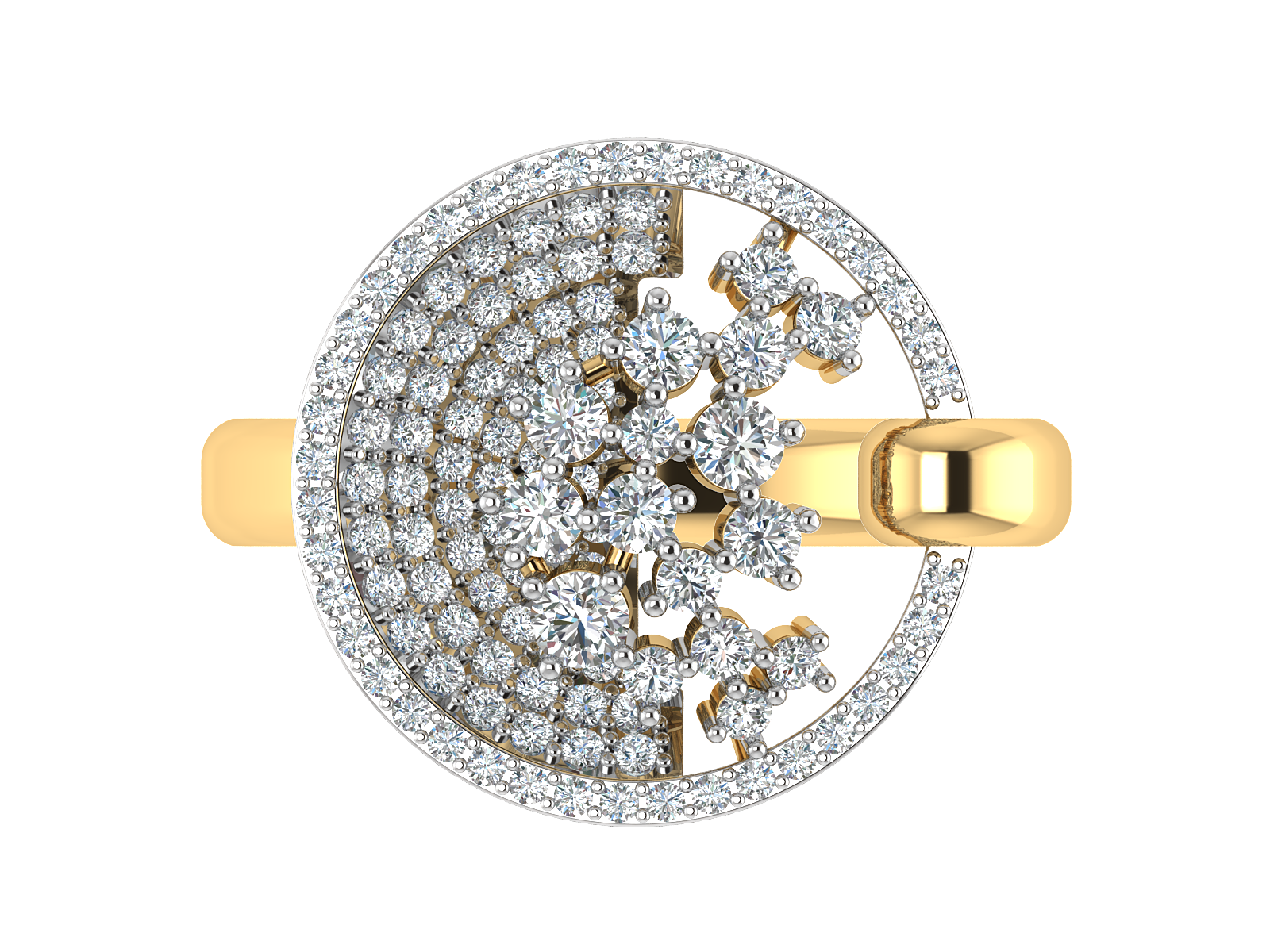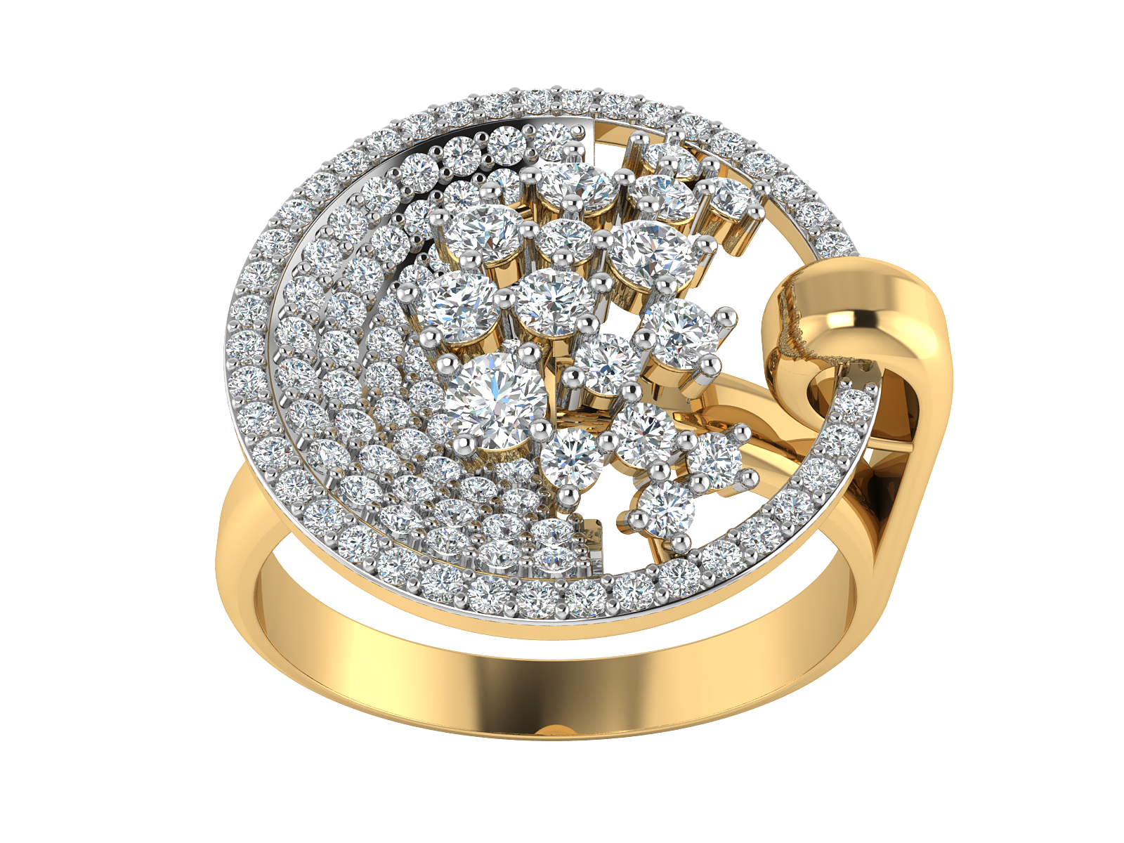 Its design features a halo of sparkling diamonds that surround a cluster of centrally set stones, which mimic a constellation of stars. The smooth, golden band splits to embrace the diamond array, enhancing its luster and appeal. This ring is a testament to masterful craftsmanship, where the brilliance of each stone plays off the others, resulting in a piece that’s not only a statement of luxury but also a celebration of detailed artistry. Ideal for grand events or as a symbol of significant milestones, this ring is designed to be treasured for generations.