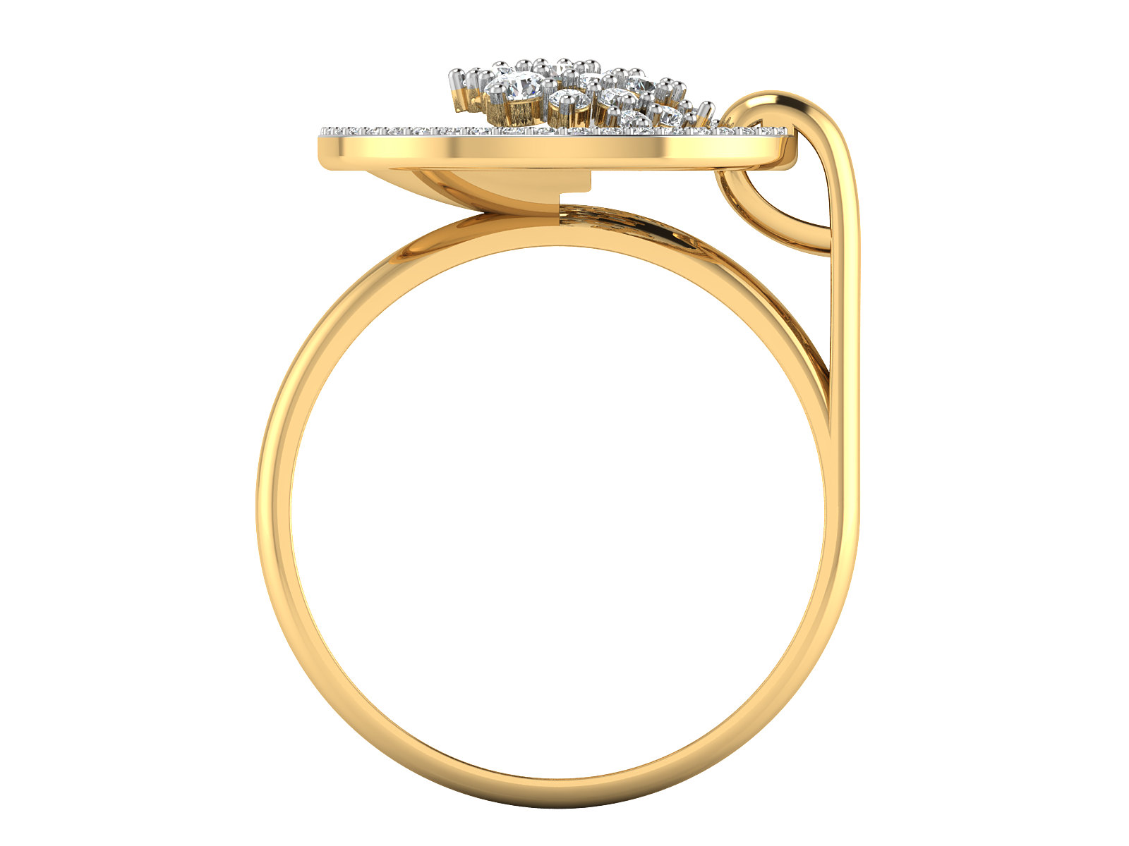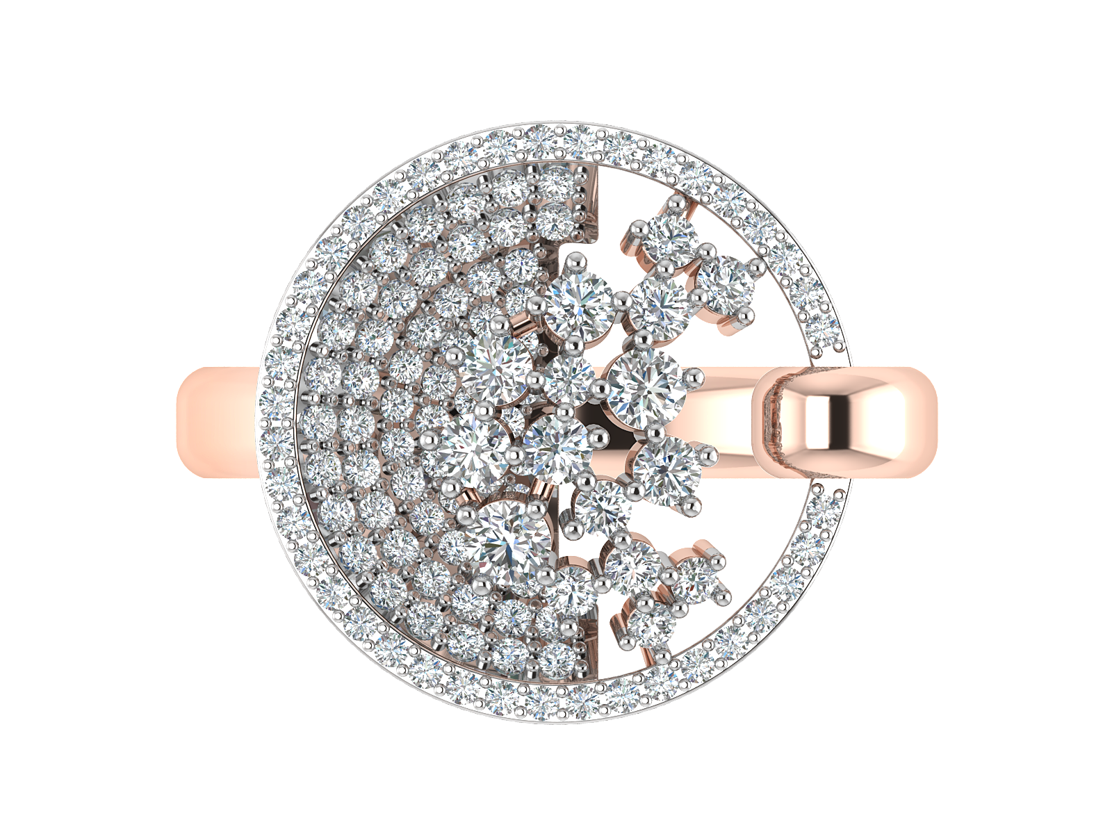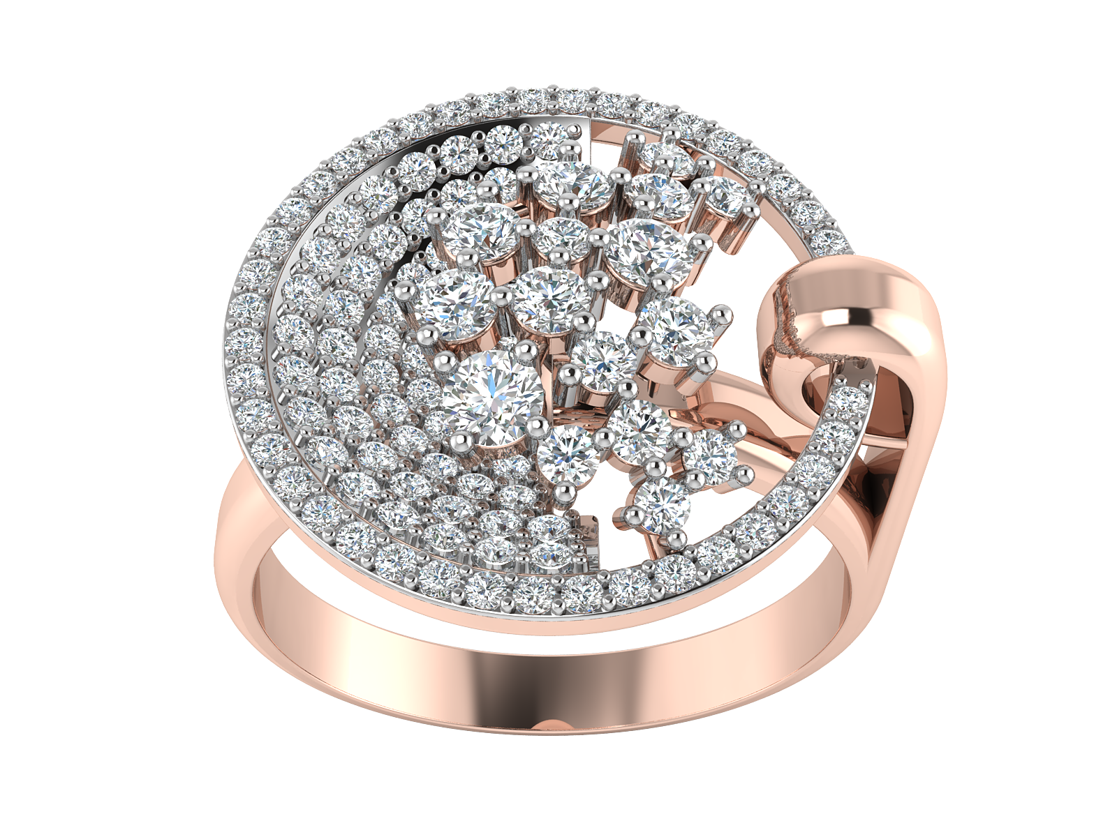 Its design features a halo of sparkling diamonds that surround a cluster of centrally set stones, which mimic a constellation of stars. The smooth, golden band splits to embrace the diamond array, enhancing its luster and appeal. This ring is a testament to masterful craftsmanship, where the brilliance of each stone plays off the others, resulting in a piece that’s not only a statement of luxury but also a celebration of detailed artistry. Ideal for grand events or as a symbol of significant milestones, this ring is designed to be treasured for generations.