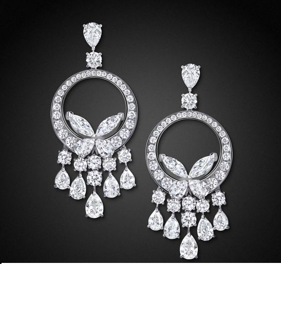 The "Lunar Cascade Earrings" feature an exquisite array of pear and round-cut diamonds, meticulously set to create a waterfall effect that echoes the cyclical beauty of lunar phases. Framed by a halo of brilliant stones, these earrings capture the allure of moonlight in motion—a statement piece destined for grand occasions. Crafted in white gold, they reflect a celestial elegance for the modern connoisseur.