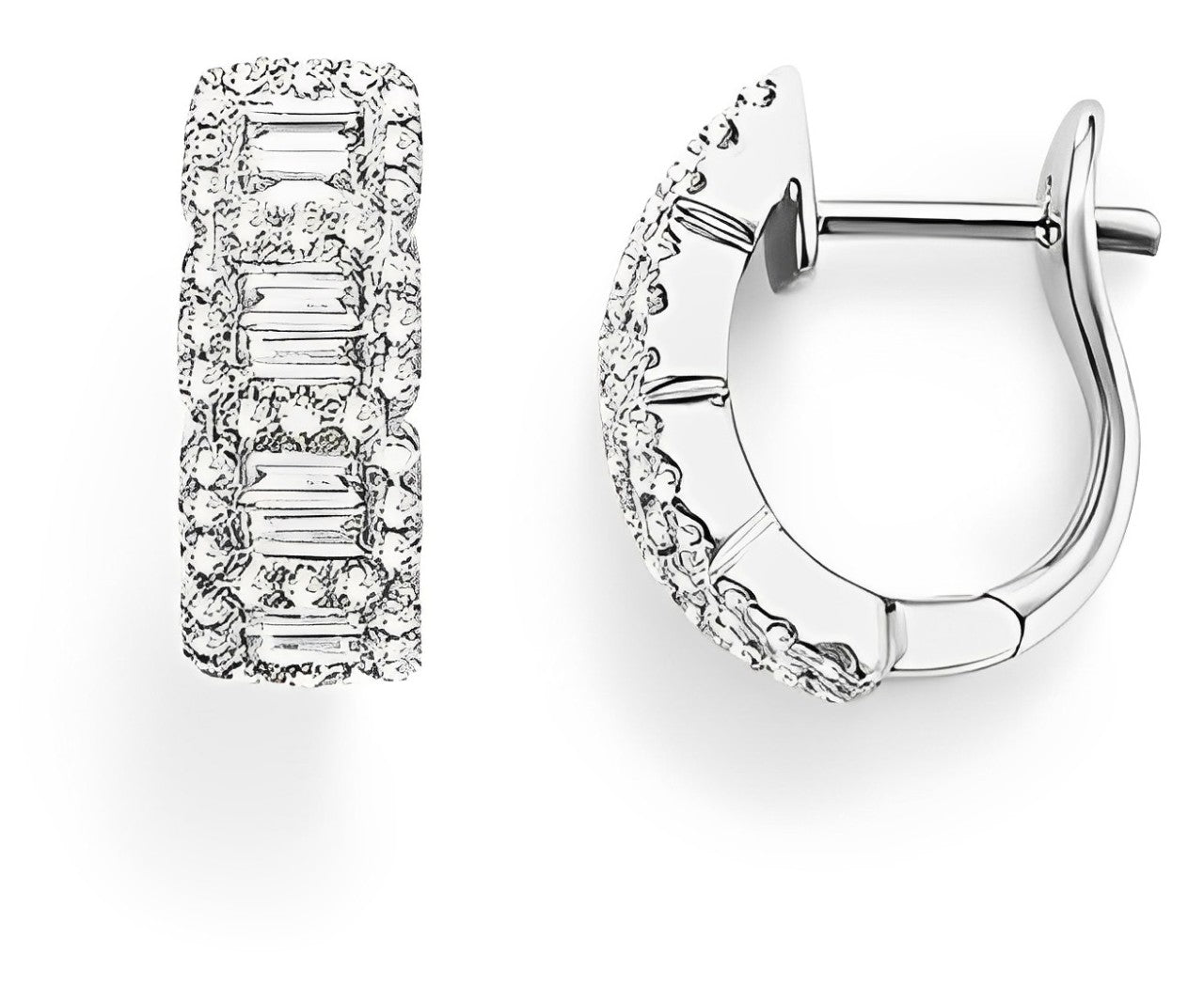The "Luxe Baguette Huggie Earrings" exude sophistication in white gold, each featuring a seamless row of baguette-cut diamonds framed by a halo of round-cut diamonds. Their design hugs the earlobes gracefully, offering a secure and comfortable fit while displaying a flair of elegance. These earrings are perfect for those who appreciate the contemporary charm of clean lines and the timeless sparkle of well-crafted diamonds. They offer a subtle yet luxurious complement to both day-to-day and evening attire.