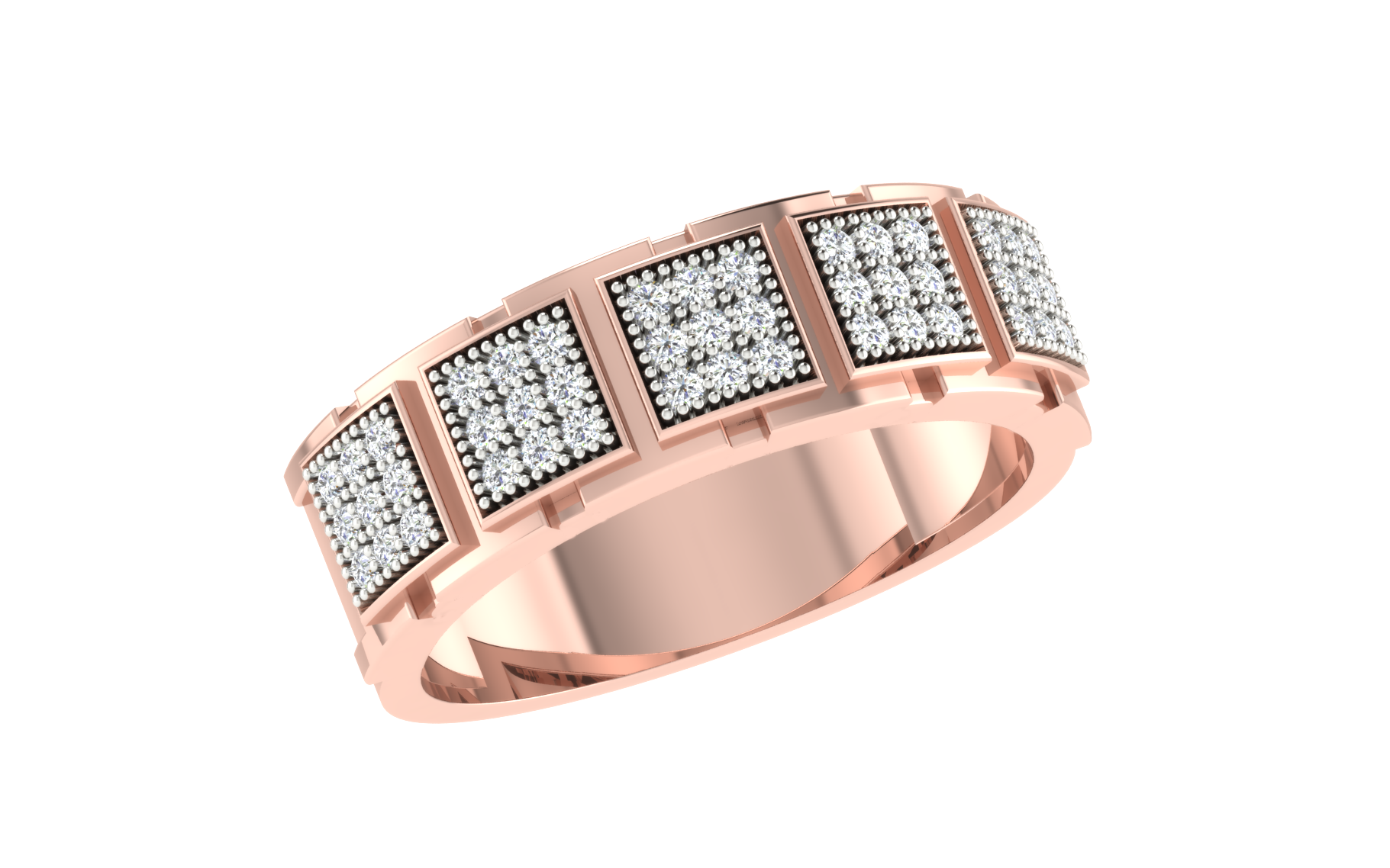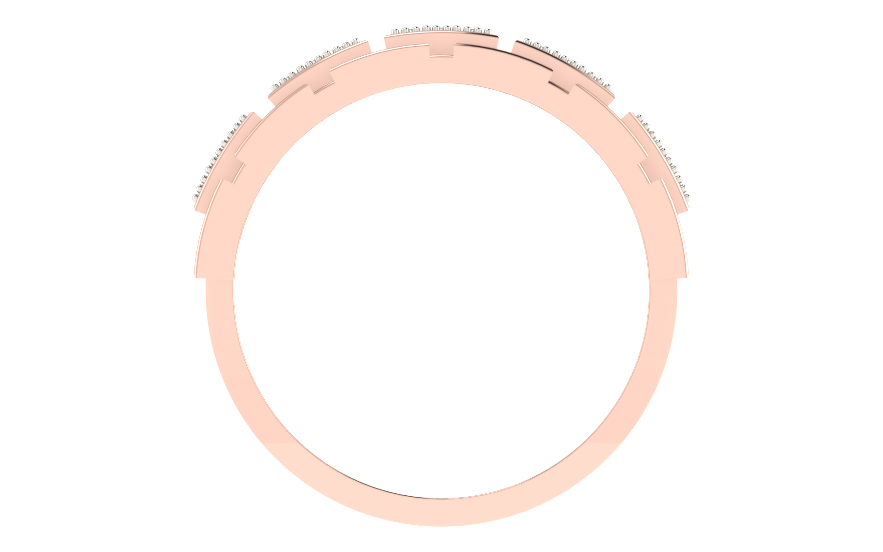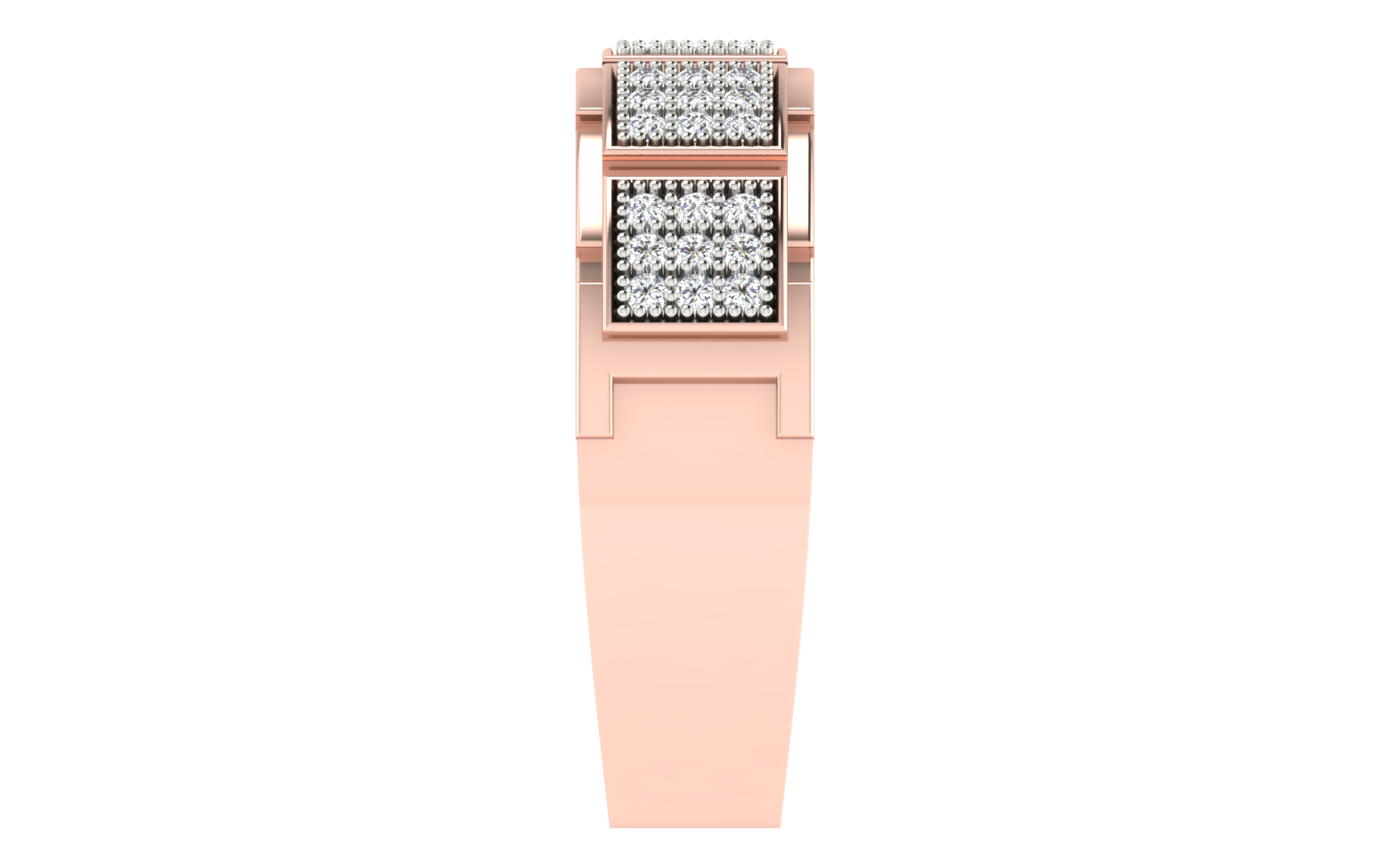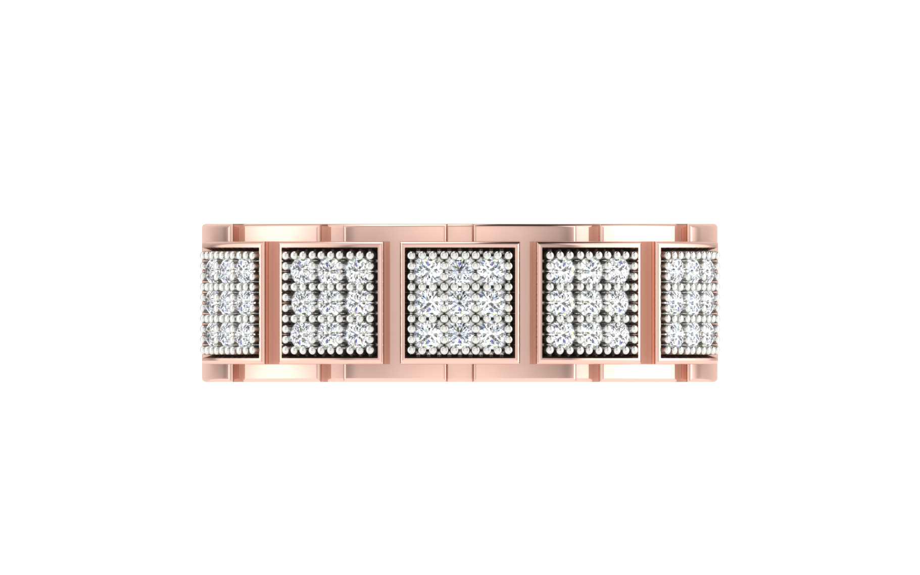 Crafted with symmetry and grace, the Rosetta Quad Elegance Band showcases a quartet of diamond-studded squares set in a lustrous rose gold band. Each square features a cluster of round-cut diamonds meticulously arranged to capture and reflect light with every movement, creating a breathtaking display of brilliance. The warm hue of rose gold complements the icy sparkle of the diamonds, making this ring a testament to modern elegance and sophistication. Perfect for adding a touch of luxury to everyday wear or for special occasions that call for a dazzling statement.