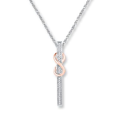 The "Sleek Infinity Column Pendant" is a graceful fusion of modernity and symbolism. Crafted from polished silver, the pendant features a vertical bar encrusted with a row of glittering diamonds, intersected by a rose gold infinity sign, seamlessly blending timeless elegance with contemporary design. This piece is a celebration of everlasting sophistication, perfect for those who appreciate a refined aesthetic with a hint of romance. The pendant, suspended on a matching white gold chain, adds a touch of infinite allure to any attire.