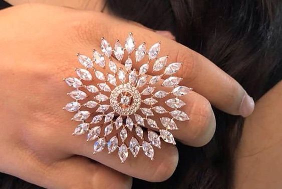 The "Solstice Bloom Ring" captures the mesmerizing brilliance of a midsummer's day. This substantial cocktail ring is a celebration of opulence and artistry, featuring a sunburst design composed of white gold. Each radiant 'ray' is a finely cut marquise diamond, meticulously set to catch the light from every angle, emulating the natural beauty of sunlight dancing on the water's surface. At the heart of the bloom, a round diamond cluster glistens like a dewdrop, encapsulating the essence of dawn's first light. This ring is an ode to the splendor of nature's cycles, symbolizing growth, warmth, and the abundant richness of life. It's designed for those who carry the light of the sun within them, spreading warmth and joy wherever they go.